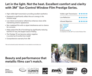 أفلام العزل الحراري من 3M وتحديدًا فئة Prestige تعد من أعلى التقنيات العالمية في هذا المجال خاصة عند استخدامها كحل داخلي للنوافذ والواجهات الزجاجية.